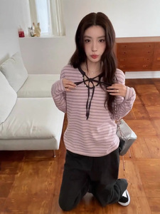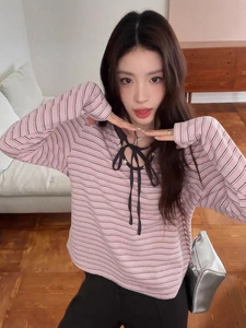韩系穿搭粉色条纹圆领长袖t恤女秋季宽松慵懒显瘦针织打底衫上衣