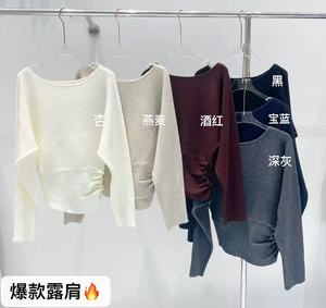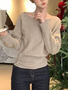 设计感褶皱收腰长袖针织衫女2025秋冬新款气质一字肩针织打底上衣