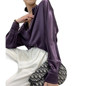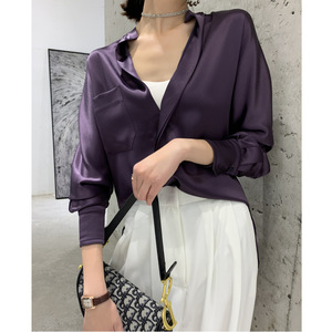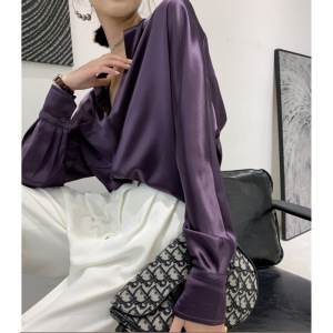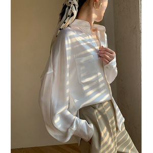 醋酸真丝缎面衬衫长袖直筒套头半开领纯色衬衣女2025秋季新品上衣