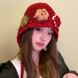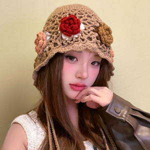 2025秋冬日系甜美花朵针织毛线帽子女镂空手工护耳包头帽保暖雷锋