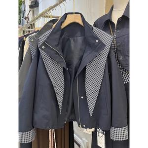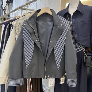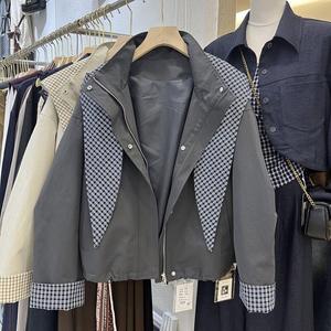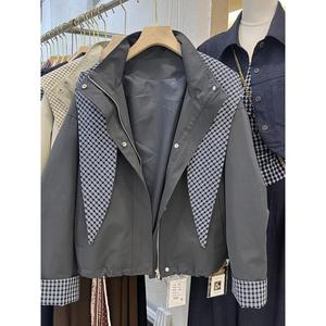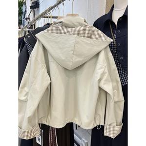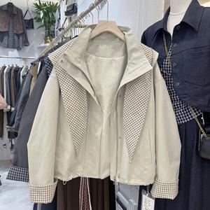 2025秋季新款韩版时尚百搭宽松显瘦格子拼接连帽短款风衣外套女
