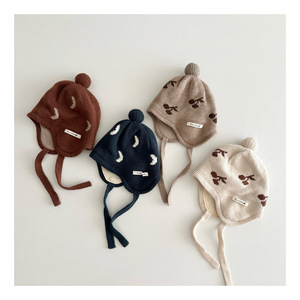 儿童针织帽小童外出保暖绑带防风护耳帽多样提花韩系毛线包头帽冬