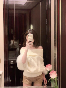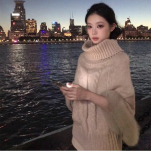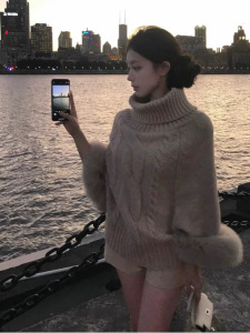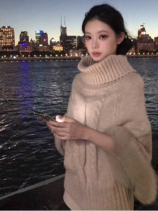 狐狸毛毛麻花一字肩毛衣女秋冬气质名媛慵懒纯欲高领斗蓬针织上衣