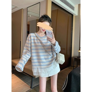 条纹钉珠长袖t恤女2025新款秋季蕾丝拼接设计感宽松韩系慵懒上衣