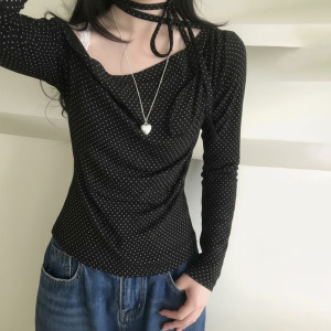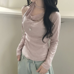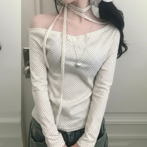 欧美新款女装ins风甜美少女波点露肩修身长袖T恤绑带设计休闲上衣