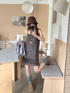 复古长袖镂空针织开衫紫色碎花吊带连衣裙女2025秋季新款时尚套装