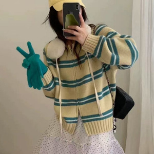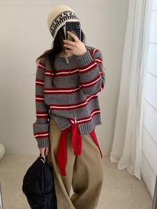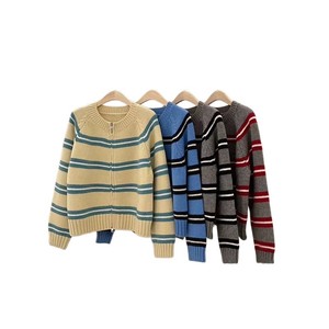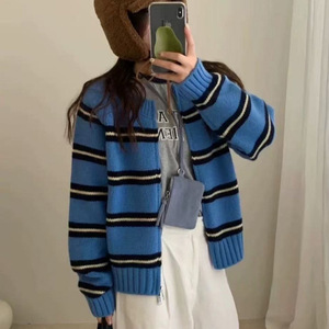 秋冬2025新款日系简约撞色条纹针织开衫女休闲圆领双拉链毛衣外套