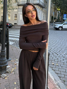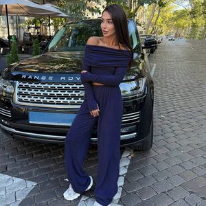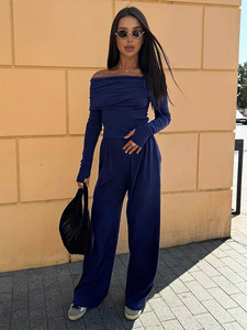 欧美设计感纯色修身显瘦一字肩针织套装露肩上衣+宽松休闲长裤