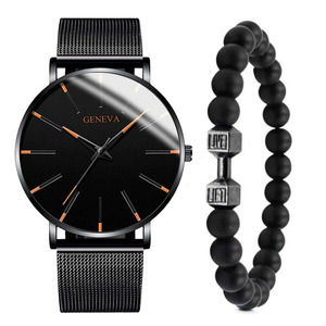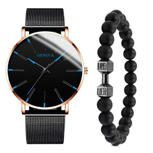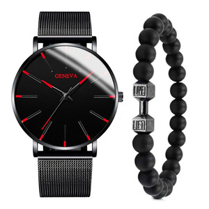 跨境爆款男士手表套装时尚简约男士商务网带石英表火山石哑铃手串