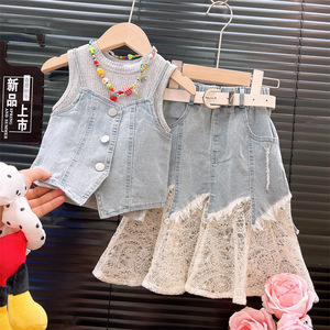 女童牛仔蕾丝套装2025夏季新款牛仔吊带无袖背心半身裙三件套