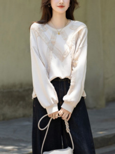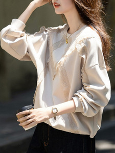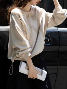 外贸2025秋季气质圆领蕾丝拼接宽松休闲弹力藏肉小个子卫衣女上衣