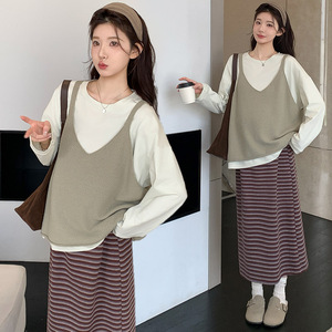 大货孕妇秋冬套装慵懒宽松长袖T恤针织马甲条纹半身裙孕妇三件套