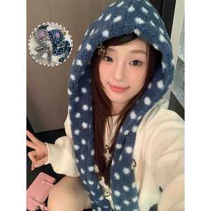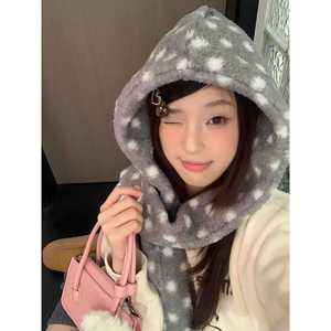 韩版蓝色波点甜美毛绒帽子女冬季帽子围巾一体百搭大头围显白装饰