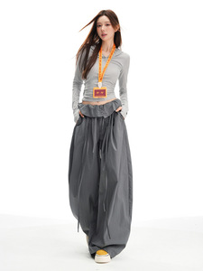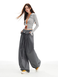 橙绢女装#金晨同款荷叶边拼接抽绳弯刀休闲裤宽松阔腿垂坠拖地裤