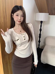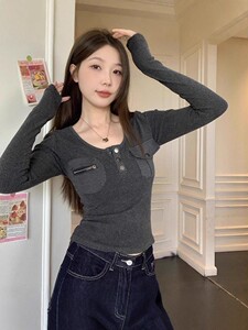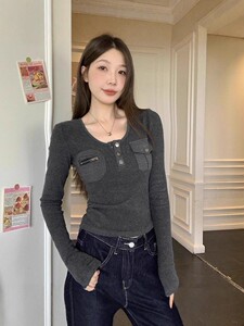 韩版v领金属扣拉链口袋设计打底衫长袖女酷辣美式修身锁骨短上衣