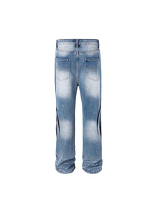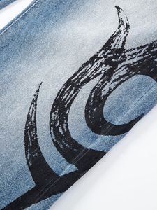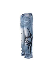 2025年新款美式街头蓝色重工猫须洗水图腾印花修身微喇牛仔裤潮男
