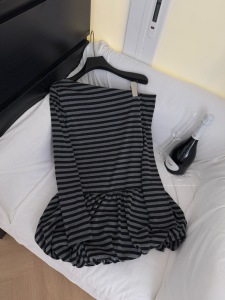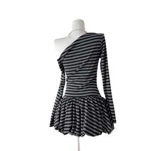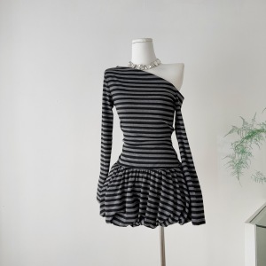 2025秋季新款休闲气质日常长袖女装斜肩条纹撞色花苞短款连衣裙