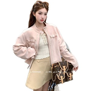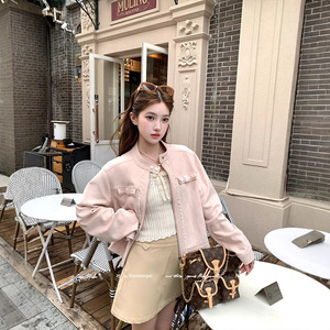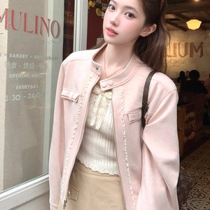 新品Acaine短款长袖粉色廓形麂皮外套秋季美式棒球服夹克显白上衣
