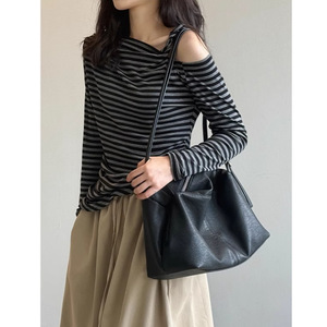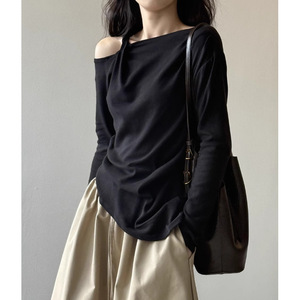 独特小衫高JI感斜肩扭结长袖T恤女2025秋季新款不规则露肩针织衫