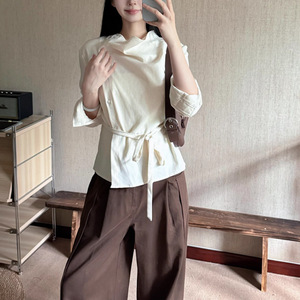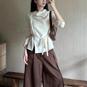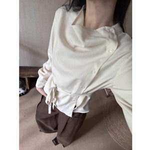 法式设计【时宜】简约不对称荡领斜门襟绑带收腰上衣女高质感衬衫