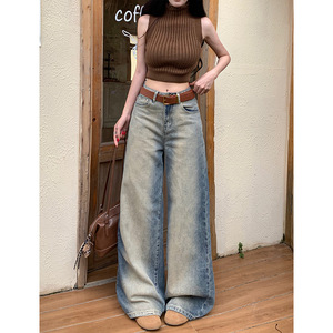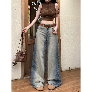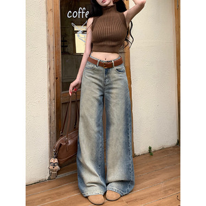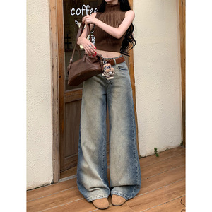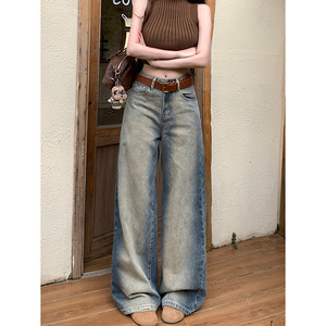 做旧晕染撞色阔腿牛仔裤女2025秋季新款低腰宽松显瘦垂感脏脏长裤