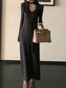 槿一2025飘带针织连衣裙女秋季新款长袖磨毛裙子收腰修身显瘦长裙