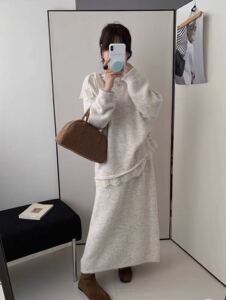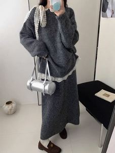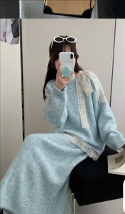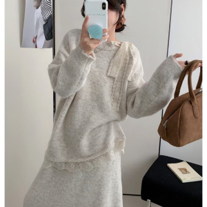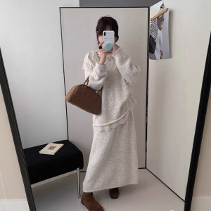 法式温柔风套装针织裙女秋冬大码胖mm蕾丝拼接毛衣半身裙两件套装