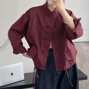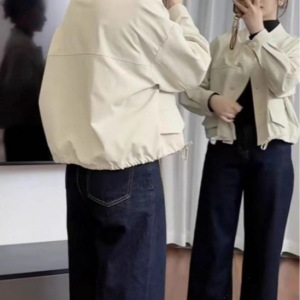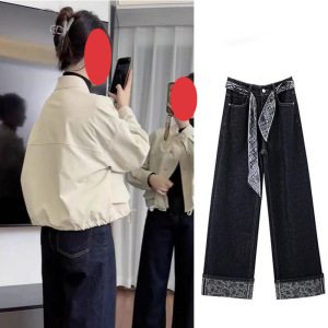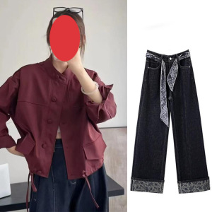 秋季时尚一整套女装2025新款抽褶短款宽松外套牛仔阔腿裤两件套