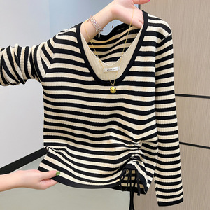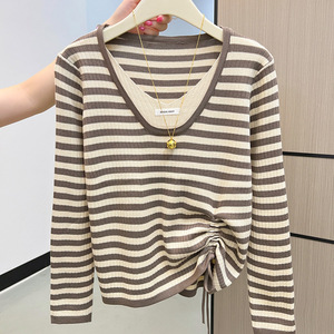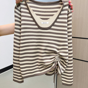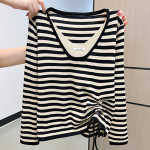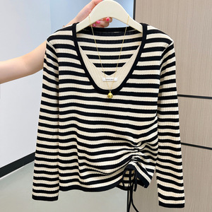 2025秋冬假两件V领T恤衫女条纹针织打底毛衣女抽绳设计长袖上衣