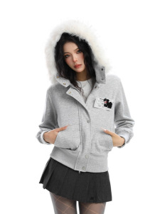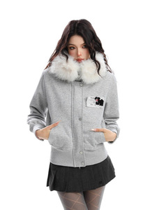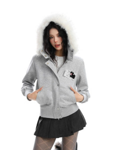 美式辣妹可拆卸毛领灰色连帽外套女春秋新款显瘦拉链短款开衫夹克