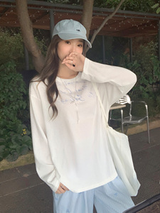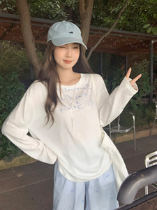 奶白色低圆领字母印花长袖T恤女2025早秋新款慵懒风正肩宽松上衣