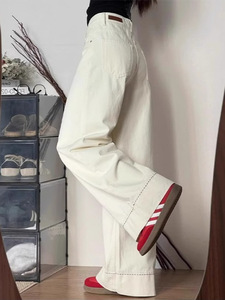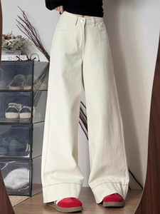 大码美式米白色牛仔裤女春秋新款梨形身材宽松高腰显瘦直筒阔腿裤