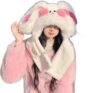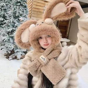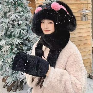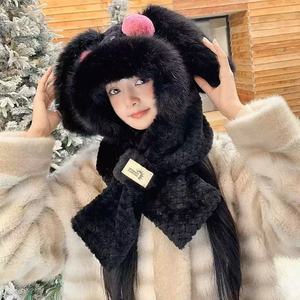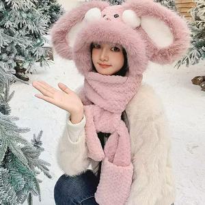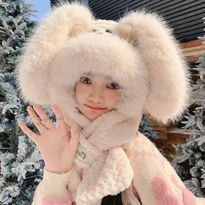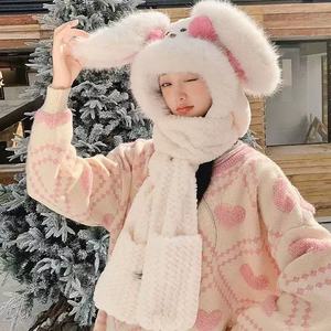 可爱腮红兔子帽子围巾少女学生冬连帽围脖骑行护耳防寒套头毛绒帽