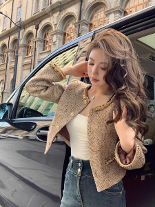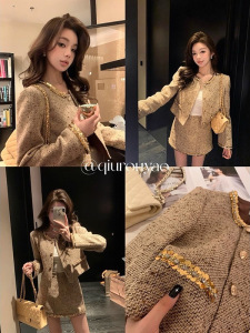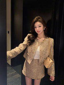 2025小香风春秋新款金色编织亮片短外套女圆领钉珠洋气短裙套装