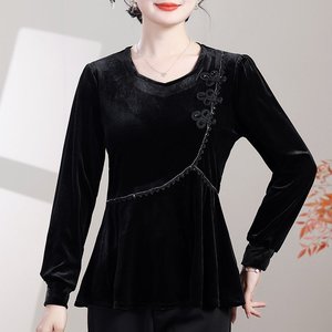 一件代发直播爆款2025秋季新款时尚丝绒中式国风长袖打底衫上衣女