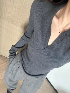 灰色polo领修身羊毛针织衫上衣韩系短款内搭打底衫翻领毛衣女早秋
