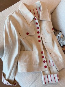 老钱风条纹拼接苎麻短外套女2025秋新款高级感洋时尚休闲百搭上衣