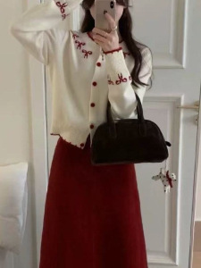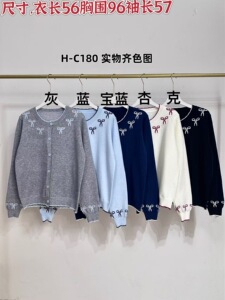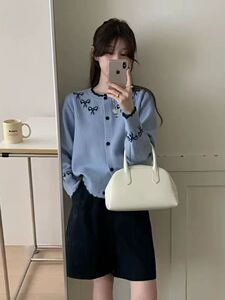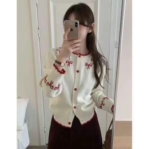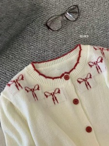 韩系蝴蝶结提花圆领针织毛衣女秋季甜美开衫小个子软糯外套上衣