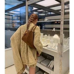 V领慵懒北海道黄昏 杏色镂空针织开衫女早秋2025新款宽松休闲外套