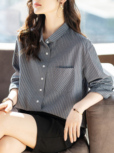 大码胖MM条纹长袖衬衫女2025秋季新款口袋条纹百搭减龄上衣A7315
