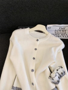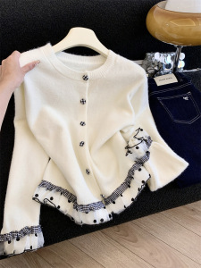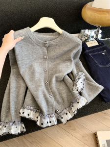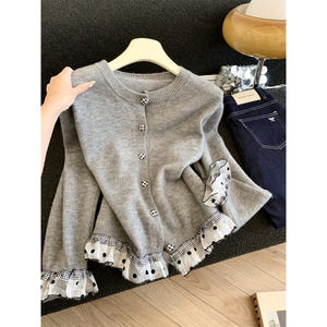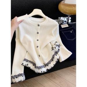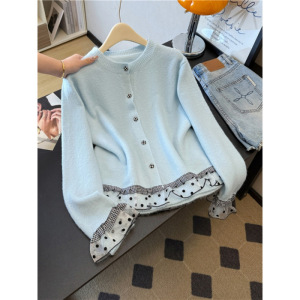 韩系甜美蕾丝拼色毛衣女针织衫开衫秋冬宽松慵懒风气质短款上衣