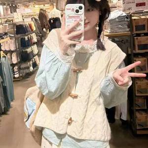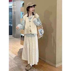2025新款学院风甜美叠穿牛角扣针织马甲+长袖衬衫+波点半身裙女