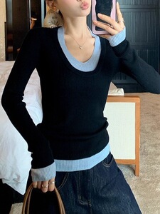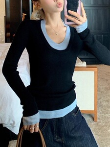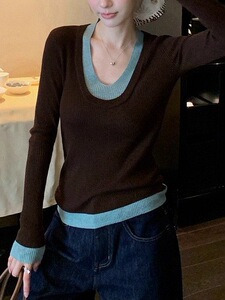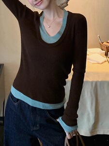 张贝ibel绵羊毛撞色假两件坑条衫复古气质V领修身显瘦长袖上衣