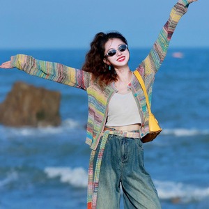 多巴胺彩虹长袖针织开衫女2025年秋季新款时髦洋气减龄外搭上衣潮