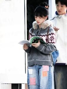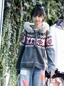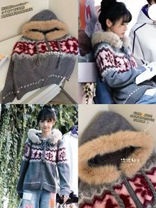 美式复古毛衣加绒加厚保暖针织衫女秋冬撞色提花宽松大码毛领开衫