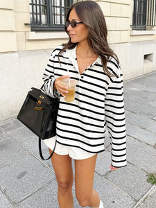 秋冬新款黑白条纹POLO衫宽松长袖T恤设计感气质休闲2025跨境通勤
