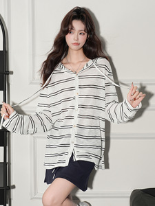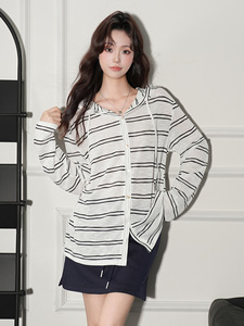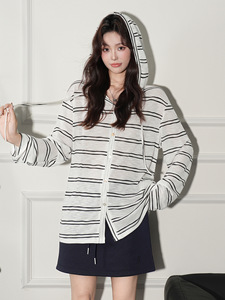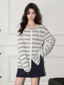 季优 黑白条纹撞色长袖开衫女2025早秋宽松薄款微透抽绳连帽上衣