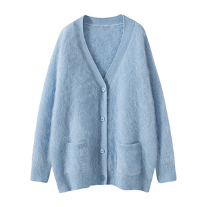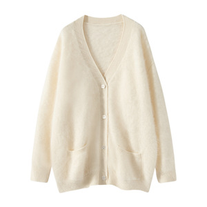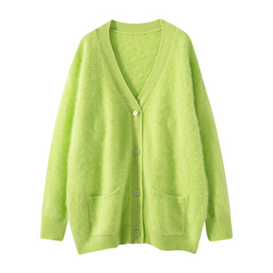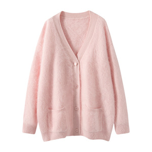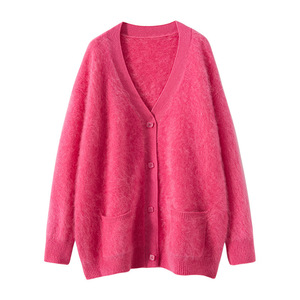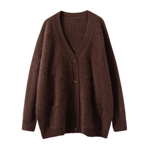 100纯山羊绒拉绒双股厚V领开衫女软糯针织毛衣宽松百搭外套