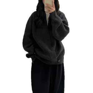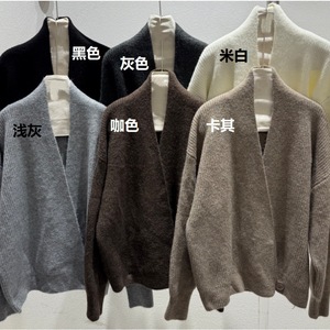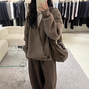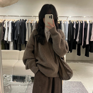 2025秋季韩系慵懒风v领开衫女斜襟设计感针织外套宽松外搭上衣