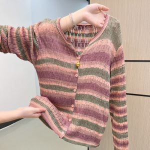时尚彩虹条纹长袖针织开衫2025春季新款宽松显瘦百搭毛衣外套上衣